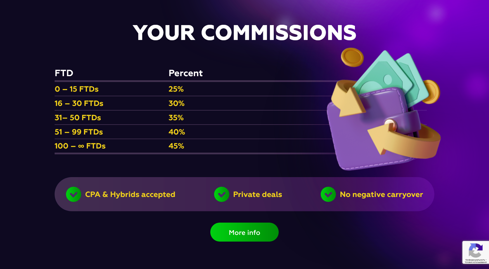 One of the key features of Playfina's partner program is its focus on rewarding performance. Partners who consistently meet or exceed their targets are eligible for additional bonuses and rewards, creating a powerful incentive to drive success. This approach not only motivates partners to perform at their best, but also fosters a culture of excellence and continuous improvement.