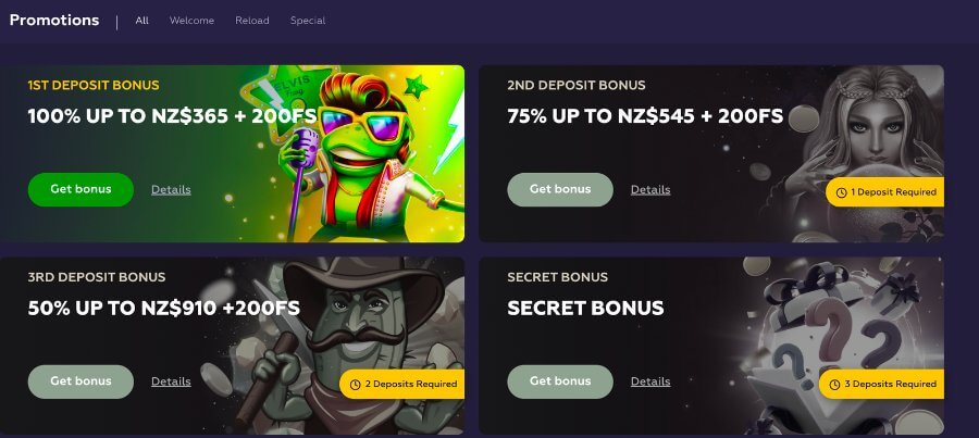 Welcome Bonus. Newly registered players can expect to get up to $200 + 50 FS on featured games after depositing at least $20. If they continue playing, they receive a 75% bonus of up to $300 + 50 FS for the second deposit and a 50% bonus of up to $500 + 100 FS for the third deposit. Also, you may get a secret bonus after making a 4th real money deposit.